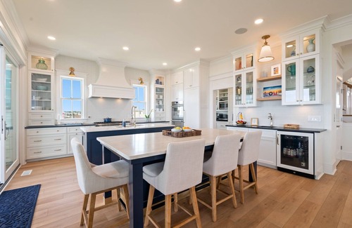 Every bedroom in this home has an attached bathroom and each suite offers something special, Three suites offer bay views with one designed for accessibility. The bunk room has 5 custom x-long beds, each with a lamp and charging station, and a 55” TV perfect for movies or gaming after a long day on the beach. The suite with a queen bed and bunks is perfect for a family. The expansive 2nd floor great room is a space for your entire group to relax and connect while enjoying the phenomenal view. The large, two-island kitchen has high-end appliances including a 48” range with griddle and two dishwashers, a huge pantry, gourmet coffee station and cocktail bar with sink and extra fridge. The enormous custom-built dining table seats 12. Enjoy the views and the fireplace from the large sofas or work a puzzle in the adjacent library.