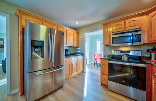 Heading indoors you’ll find welcoming spaces filled with comfortable furnishings and charming décor. The living room keeps those stunning views front and center with abundant windows flooding the room in natural light. It’s the perfect spot to unwind together on the plush sofa or loveseat while streaming a new movie on the mounted smart TV. The roomy kitchen offers all of the comforts from home with stainless steel appliances, a drip coffee maker, and cabinets stocked with cookware and dining ware ready to assist in all of your culinary aspirations. Take formal meals at the dining room table with seating for 6 or enjoy a light lunch or your morning coffee in the breakfast nook with seating for 4. Traveling during the holidays? You’ll be delighted to find that the home has been decorated for Christmas, surrounding you in seasonal cheer.