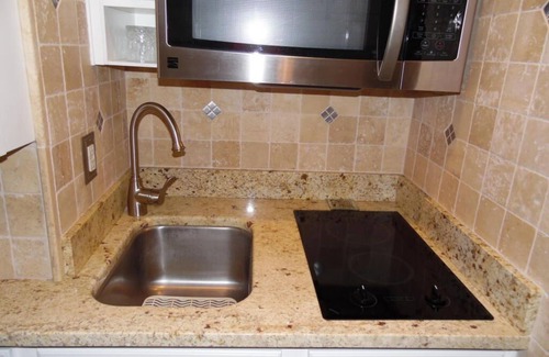 Engineered wood floors, custom cabinetry throughout, granite countertops in kitchen, entirely tiled full bath w/ rain forest marble countertop. Well-appointed with comfortable accessories, linens & towels provided, well stocked kitchen including a spice rack plus a Keurig Coffee Maker (carafe style also) & also beautifully furnished. One queen sized bedroom & Lazyboy sleep sofa in living room. Queen Size Air mattress also available. Just bring your personal items, beach towels & favorite pillow if desired (nice bamboo covered pillows provided). Shower Dispenser just installed with Shampoo, Conditioner & Body Wash.