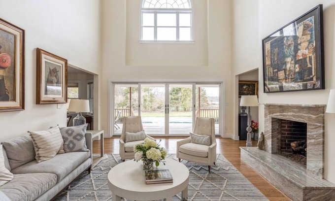 Ideally located minutes from the beach and town, this newly renovated 4-bedroom traditional with a pool offering magnificent sunset and views to Poxabogue pond and Wolfer. Sliding doors lead out to a large covered porch, with a vast outdoor recreational area. The newly renovated kitchen by Bates and Kropp and beautiful double-height living room with an office/library is a wonderful place to relax and view the preserve. A first-floor master bedroom and second-floor master with a large balcony gives a perfect setting for resting after a day at the beach. There is also a finished basement for kids to play with, a movie theater and a gym area with an Echalon bike, rowing machine, and Tonal smart gym. Ride your bike to Sag Main beach or Bridgehampton, or walk to Wolfer and Loaves and Fishes.