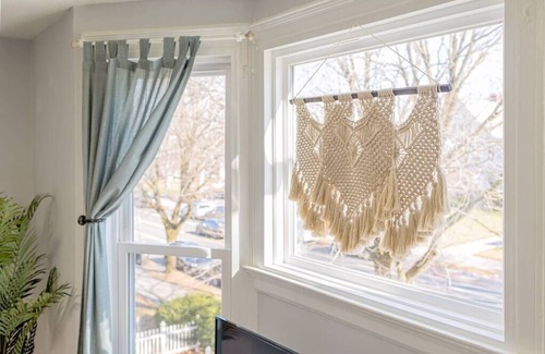FREE OFF STREET PARKING! This 3 bedroom bright and sunny space has all the style and comforts to bring some extra joy in your life. Located in East Rock, arguably one of the most desired areas in New Haven, you'll find amazing restaurants including the incredible Nica's Market and Blue State Coffee in short walking distance, beautiful streets and parks to explore and shopping close by. Also Yale is just up the street! Sunshine Central: 2nd floor, 2-level apartment. Sunlit rooms, bohemian style, queen beds, ambient lighting, room darkening curtains. Cozy living room, large couch, chaise lounge, leather chair, Roku TV. 2 beautiful bathrooms, spa glass showers. Washer, dryer on 2nd floor. Linens, toiletries provided. Well-equipped kitchen, sunny with sheer curtains, gas range, pots, pans, spices, teas, coffee, Keurig. Marble island, bar stools, dining table for 4. The East Rock neighborhood of New Haven, named for nearby East Rock, a prominent trap rock ridge and hiking trail, is one of the premiere neighborhoods in the city. The area is home to a large group of Yale staff, and faculty, as well as many young professionals and families. East Rock is also a popular destination for cyclists, as a city bike lane runs along Orange Street, the neighborhood's spine. The abundance of coffee shops, eateries and the like make this a must see while in New Haven. Orange street is considered a main artery of New Haven. Access to bus routes and the train is walkable. Parking at the unit is off street for one car. Let us know if you have more than one coming and we will provide additional parking passes.