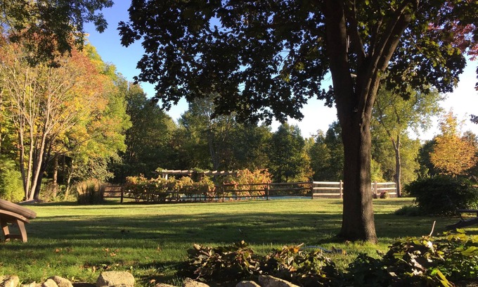 The property is near the crest of a hill, facing south with sun all day long. Looking Glass Hill is a less-travelled road, close to 202 and 5 minutes from the center of Bantam (with Arethusa, Bantam Market, antiques, a farmer's market, Bantam Lake). Cars rarely drive by and the back of the property is very private.