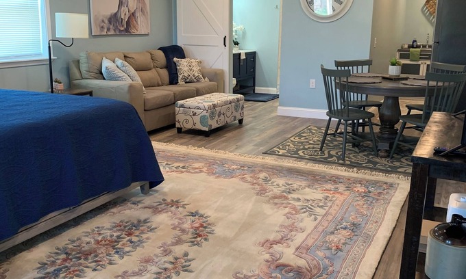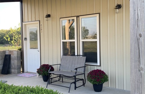 Quite country setting with easy access to Hwy 75. If you're traveling with your horses, this is the perfect place for you! Heading to the rodeo? Perfect! We can accommodate. Trailer parking as well. Traveling to a car show and need safe and secure inside parking for your show car? Come on over! We can accommodate. This is a separate studio apartment that has been totally renovated. Walk-in shower, comfortable queen size bed, 65" TV, full size refrig, coffee makers (2), microwave, toaster oven, hot plate, air fryer and toaster (no stove). Horses stay (each) $5 / night (can accommodate up to 4 horses) and garage parking for show cars $15 / night. Message me if you have any questions.
