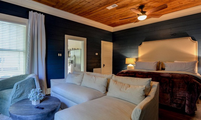This unit is part of a lovely older home with a private porch entry and ample space for a studio. It includes a king bed with sectional sofa in the sitting area, a full kitchen, bath with double vanity, and washing / dryer. The space can accommodate up to 3 guests utilizing the couch for additional sleeping space. It also has beautiful classic interior design touches with an original mantle, wooden ceiling, sultry navy ship lap siding and stainless steel appliances.