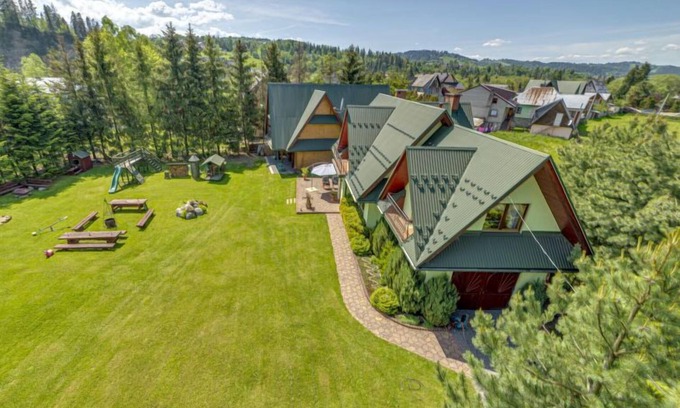 Chalet "Super Hacjenda". 4 apartments in the property. In a quiet, sunny position, 100 m from the edge of the forest, 500 m from the skiing area, 200 m from the river, in the countryside. For shared use: property 5'000 m2 (fenced), lawn, orchard, swimming pool (above ground) (5 m diameter, depth 125 cm, seasonal availability: 01.Jun. - 31.Aug.). Garden furniture, barbecue, fireplace (swing, sandbox). Motor access to the house. Parking at the house on the premises. Shop, grocery, restaurant 200 m, bus stop 200 m, indoor swimming pool 3 km, thermal baths "Białka Tatrz./Bukowina Tatrz." 5 km. Tennis 200 m, riding stable 2 km, ski lift 500 m. Please note: suitable for families. The owner lives on the same property. 40 ski-lifts within the distance of 10 km. Possibility of organizing sledging (extra).
