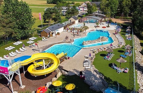 Supervised and heated outdoor aquatic complex, including 1 swimming pool, with slopes and slides, 1 heated paddling pool, spa and balneotherapy bench.
