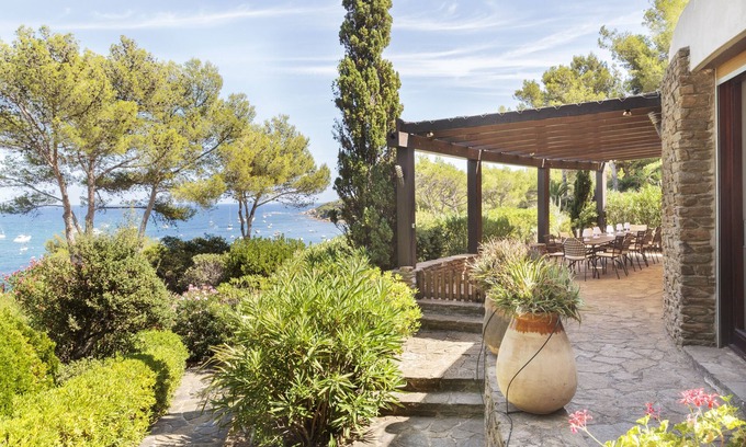 In the private and guarded domain of Gaou-Bénat, in Bormes-les-Mimosas, the villa is located on the seafront, facing a private cove. Access to the two private sandy beaches, the restaurant, tennis club, sailing school, grocery store with catering service, on the estate, is on foot (150 meters).
