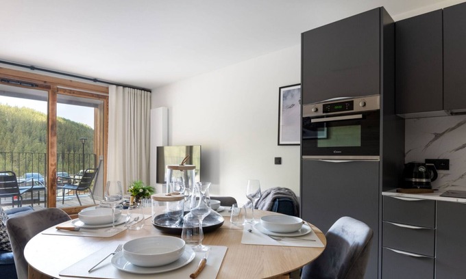 You will appreciate its bright living room with open and equipped kitchen, and the 11 sqm balcony facing North-West and offering a superb view of the Valley. Made for a family stay, the apartment is decorated with quality materials carefully selected. It has a bedroom with a double bed, an mountain corner with a bunk bed, and a bathroom with walk-in shower and separate toilet.