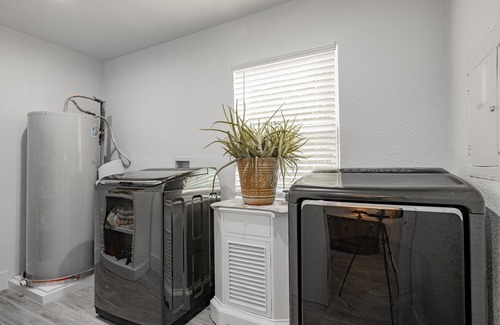There is an oversized half bathroom on 1st floor that incorporates a full sized washer & dryer. (laundry soap provided)
