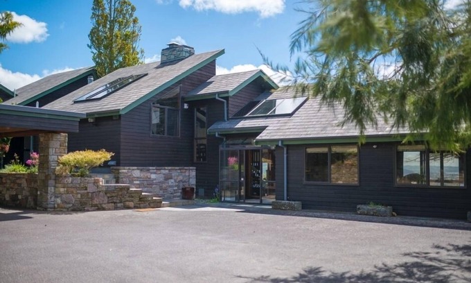 The retreat spans a 2895 square meter with spectacular unsurpassed view of the city, Lake Rotorua, Mokoia Island and adjoining rural farmland. This multi-level, cedar weatherboard and slate roof, 320 square meter lodge with floor to ceiling picture windows captures superb landscape and all day sun. With spacious versitile living areas leading to a step down snug with soaring stone fireplace, the perfect retreat is furnished with whole set new furniture. The well-equipped modern roomy kitchen and dining room lead to the north west wing with the seperate master suite on the upper level boasting a walk through dressing room and generous ensuite with rural view.
