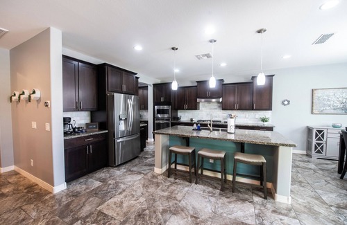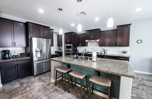 The expansive kitchen and open concept living area are perfect for cooking and entertaining. The kitchen is fully stocked and has a gas stove. Walk from the kitchen through the butler's pantry to the game room, mix your favorite cocktail, and pick up those ping pong paddles!