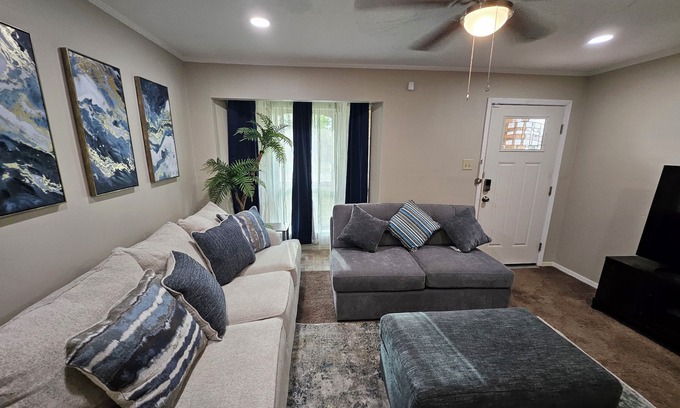 Mesquite is waiting for you at this brilliant 2-bedroom, 1 bath house. With very soft queen beds, and a crib, this cozy retreat is perfect for families getaways. Enjoy a 65' smart TV in the living room with comfy sofa bed for extra guests. Bathroom is ADA compliant to ensure everyone stays refreshed during their stay. Experience the magic of Mesquite at our serene home. Max guest 6 (number includes adults, children and infants).