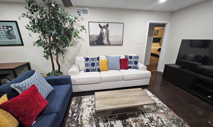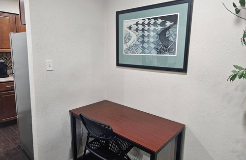 Keep it simple at this peaceful and centrally-located place. Enjoy the Triple "T" effect (Therapeutic, Tasteful, Thankful) right in the heart of Mesquite! Infants, Children and Adults, all welcome! Enjoy the outdoors with a Barbecue grill in a fenced yard and a dinning area. You are gonna love every bit of the experience: Soft beds (1 King, 2 Queen + 1 Queen sleeper sofa), high quality linens & towels, nice decor, full kitchen, indoor foosball game, 65' Samsung Smart TV, and 43' Smart TV in Masters. Game on! Be my guest!!