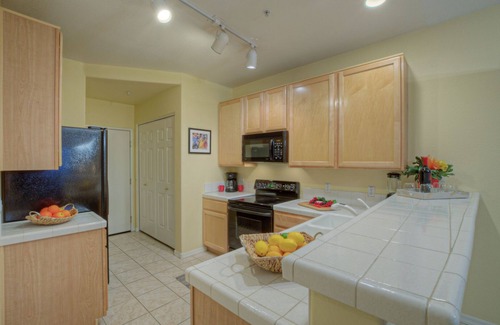 The laundry area and door to the garage are in the alcove adjoining the kitchen. Laundry tasks are quick and easy with the new washer and dryer hidden behind bifold doors. Highchairs and Pack 'N Plays are available to rent.