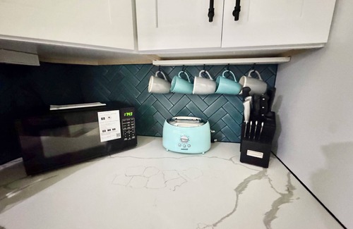Fully equipped kitchen — complete with stove, oven, microwave, fridge, coffee maker, cookware, and all the kitchen tools needed for cooking and dining in
