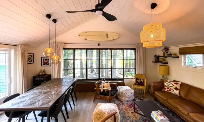 Our cozy beach house has been completely renovated with lofted shiplapped ceilings and wood panelled walls and has been gorgeously decorated with an eclectic mix of new and vintage finds that make guests feel as though they are in a beach house in tropical locales. Enjoy our vinyl collection or bring your own to play on our record player. Books, magazines and puzzles are provided for your enjoyment. There is a children's library in the bunk room. If you need to work while you're away, we have excellent 1 gig dedicated internet and a work space in the primary bedroom.