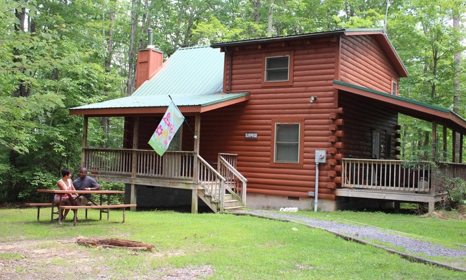 Surprise is a 2-story cabin with a private hot tub and gas fireplace. This 2-bedroom WV log cabin rental is spacious at 1106 sq. ft. and sleeps up to 8 in 1 King and 1 queen bedroom, a queen sleeper sofa and an upstairs full-futon sleeping area. There is 1 bedroom and 1 bath both upstairs and downstairs.