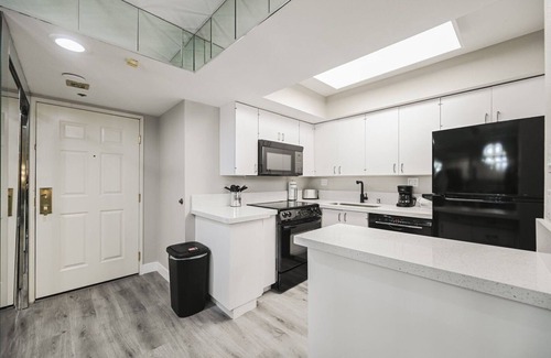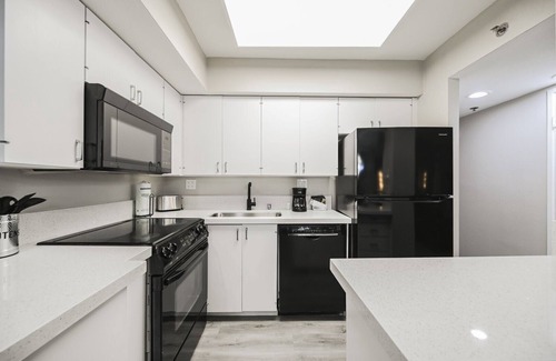 The fully stocked kitchen has all the dishes and cookware you will need for your stay. It also comes with essential appliances, including a refrigerator, flat-top stove, oven, dishwasher, and microwave.