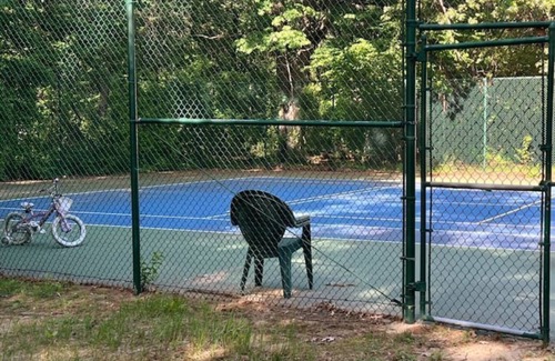 Sprawling front yard with lake views and lots of space; a fire pit area (bring marshmallows for s'mores). Back yard abuts tennis/pickleball court.