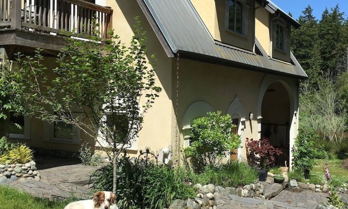 A unique three story custom home just six miles from downtown Port Townsend. This home sits on five acres at the end of a private road. The grounds are landscaped with a large open field, two fire pits, one with a slow cooker grill for outdoor cooking. There is a wetlands on the property with ducks, heron and a variety of bird life. There is a large private bedroom on the first floor with a king size bed, mid-sized TV and half bath. With a hot tub just outside the back door. The second floor has a living room / dining area, kitchen, bedroom with a TV room with a very large TV and a full bath. There are two decks on the second floor. One overlooking the south yard with a small table and chairs, umbrella and a clean BBQ. The second deck overlooks the wetlands. From the second floor there is a large ladder (very easy to climb) to a large third floor loft. The loft has a library and an area perfect for kids indoor play. There is a queen size mattress for overflow guests or kids and room for one or two blow up mattresses. (As with most loft spaces the sound from the third floor can be heard on the floor below. So this is not for someone who needs privacy.) The kitchen has a Viking range, a Bosch dishwasher and is fully supplied with everything a cook would want or need. The refrigerator is a small, under the counter size, and there is a full size refrigerator/freezer in the first floor carport.