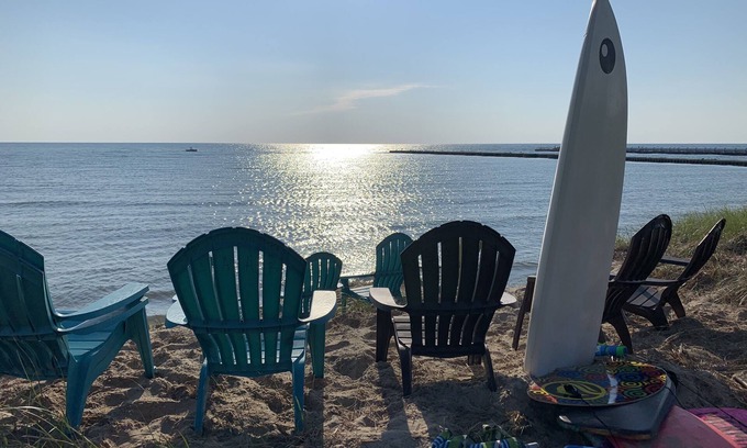 Prime July dates still available (reduced price and stay length) due to last minute cancellation. Quintessential Lake MI beach cottage w/modern amenities, direct access to wide sandy beachfront. Ideal for beach getaways or flex/staycations (300 mbps Wifi throughout). Perfect for multi-generational family or friend gatherings of up to 10. For larger groups or extended family gatherings, our bonus companion guest suites (separate rental fee), Pine Nut and Pine Cone, just 50 feet away, offer 2 separate living/kitchen spaces with A/C and all amenities and comfortably sleep an additional 8+, for a combined capacity of 18+. Rent all 3 spaces together (ask for our discount) for safely-distanced, comfortable vacations with extended family and friends, yet dine/gather together outdoors for sunset meals on the deck, group bonfires and beach activities and more!