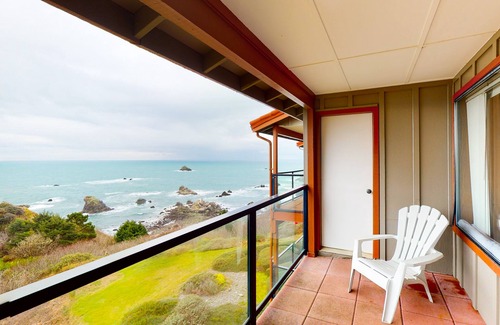 The living space is inviting and comfortable, offering plush furnishings, a fully appointed kitchen, and a private washer/dryer to refresh your salty bathing suits and hiking clothes at the day's end. But the heart of this condo awaits outside on the oceanfront balcony, where you can take in a dramatic, 180-degree view of the ocean, the sea stacks and small islands that sit just offshore, and the California coastline off in the distance to the south. If you follow the short trail down the bluff from this small, gated community, you'll reach a secluded, sandy beach that's perfect for strolling, tidepooling, and exploring the rocky caves.