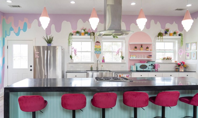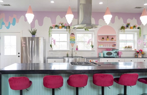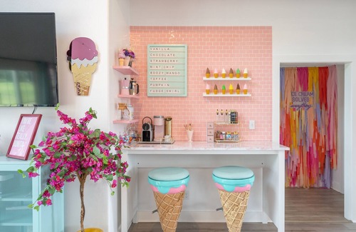 Full of color, funky patterns, and sweet surprises, this home is truly one of a kind! The living room is adorned with soft seating, an ice cream chair, a large TV, and tons of fun ice cream-themed decor pieces.