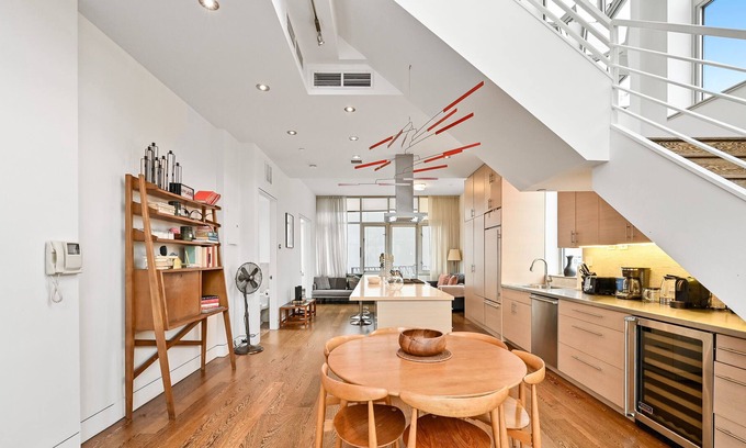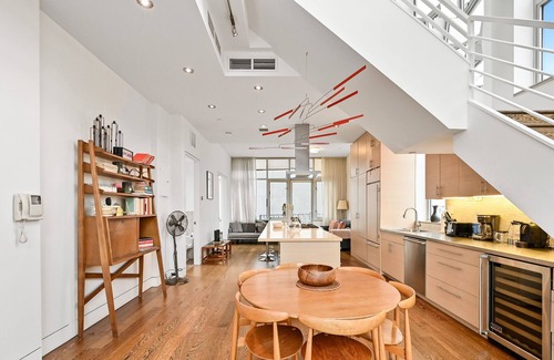 This stunning triplex penthouse masterpiece is located at the pinnacle of a low-key boutique building. The wood-burning fireplace and mantle in the living room serve as a focal point for the space’s 34+ foot ceilings, architecturally noteworthy stairs, and enormous gallery walls with a display of an impressive art collection. An extra 1,000 sqft spanned across the five outdoor areas, including a private lap pool with spectacular 360-degree views on a two-tiered rooftop with an outdoor kitchen.
