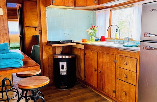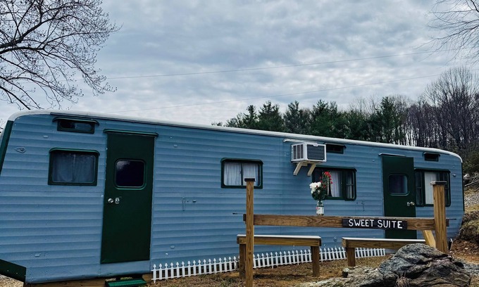 Sweet Suite is one of our biggest caravans with two distinct bed areas and a large couching the living room. Green Acres Resort hosts vintage travel trailers refurbished to a comfortable standard of coziness. We feature a spring-fed swimming pond with its own golden sand beach, pickleball courts, fire pit and bbqs, and a custom bathhouse. Floyd Virginia is the heart of the countryside and the stars shine bright out here. We are excited to welcome you to Green Acres Resort!