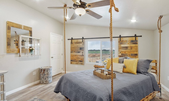 Float to sleep on a uniquely handcrafted hanging bed which is the highlight of this beautifully decorated upper floor studio apartment. It is very secure and the gentle swing of the bed can easily be stopped if you don’t like motion. With a soda shop only steps away, it makes this stay extra “sweet!” The newly constructed suite is in the upstairs of a warehouse, with fantastic views of farm fields. This fresh, vibrant place is just a short drive to many national parks and festivals! Come enjoy!