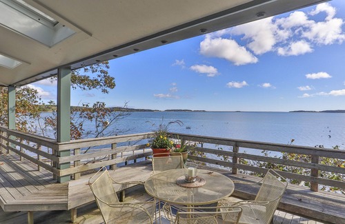 This updated 4-bedroom 2-bathroom home has the best view on Pleasant Bay, hands down. The open floor plan is ideal for large family gatherings, and conversations blend easily through two large sliders that open onto an expansive deck overlooking the Bay. This nautical-style "Old Cape Cod" cottage sleeps 8. Two waterfront bedrooms—one with a king bed and one with a queen bed—have commanding views of Pleasant Bay. A third bedroom on the second floor sleeps two in twin beds. A fourth bedroom on the first floor has a queen bed with an adjacent first floor bathroom.