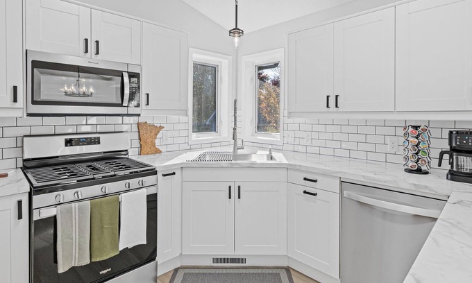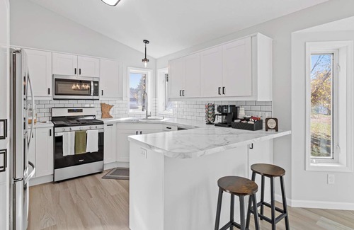 This newly remodeled home features 4 bedrooms, 2 bathrooms and plenty of space to hang out, relax and shoot some pool so you can bring the whole family! The main floor has comfortable couches and a dining room with a fully stocked kitchen. The lower level also features plush relaxing seating with a large screen TV, pool table, and bar table with stools.