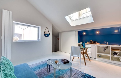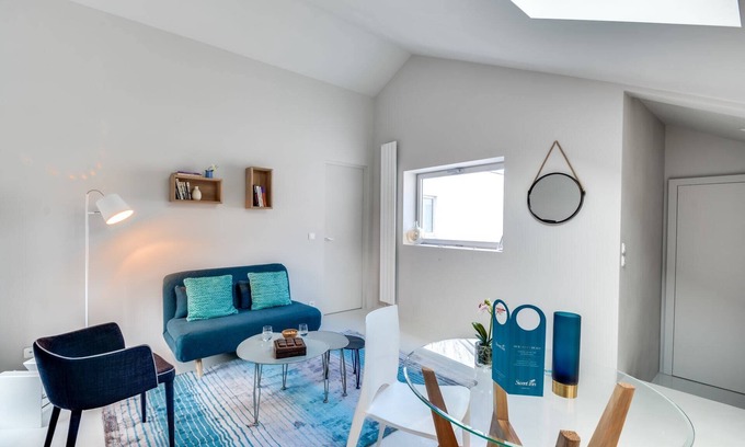The Brune X is an urban one-bedroom Sweett apartment that reflects perfectly the modern diversity of its neighbourhood here in the XIV arrondissement. Our local interior designer has fashioned a space that resembles a painting, using a colour scheme of refreshing blue and white. The abundance of natural light from the skylights floods the area, while the twinkling fairy lights provide a whimsical touch of enchantment.