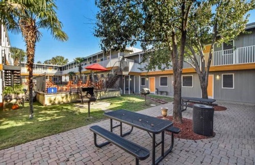 The kitchen is fully stocked with cook ware, dishes, microwave, dishwasher, coffee maker, and utensils. We also have 2 large courtyards that are great for relaxing outdoors. There are outdoor grills, plenty of outdoor seating! This rental comes with one free parking space.