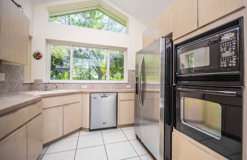 This villa is a paradise where nature, peace and luxury combine! Villa 101 is the only villa available for rent by Olsen Lake, a magnificent natural lake with a rich wildlife such as Sandhill Crane, Raccoon and Armadillos. Our pedal boat comes with the house and is yours for discovering the beauty of Olsen Lake and its inhabitants! But you can also enjoy the view from the fully renovated overflow pool, the protected veranda or the master suite soaking tub if you prefer! Our villa accommodating up to 8 people thanks to the pullout couch in the living room - has plenty of sun from morning to evening with wonderful sunsets on the lake. The spacious patio with sun deck chairs and side tables by the pool with attached Jacuzzi or inside the Lanai with a big dining table, gas and charcoal barbeques will make you never want to leave again! Decorated with light colors, beautiful furniture, spacious leather sofa and various pieces of art, the interior of the house is also perfect for rainy days or fresher evenings! One of the rooms has a beautiful view on the garden, the others on the lake and the pool. The kitchen is fully equipped with various kitchen utensils, dish washer, oven and a brand new fridge with plenty of space in case you want to prepare a special meal. Of course, the house has also a powerful Wi-Fi! If you are looking for calm and nature, but in an exclusive and spacious villa, this should be your pick!