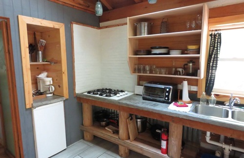 The kitchen has a built in eating area which features a concrete countertop with embedded quartzite we harvested from the stream that runs alongside the cabin. There is a four burner stovetop, a dorm sized refrigerator, toaster, coffee pot and the cookware and dishes are provided. There is a handcrafted custom bench and stools for the eating nook. The bathroom has a sink, toilet and shower, which feature locally harvested, and aromatic red cedar. The cabin has a propane wall heater for the winter and air conditioning for the summer.