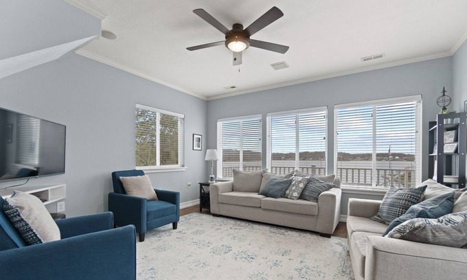 Kick back and relax in this open, stylish space and enjoy the beautiful views across the lake from the elevated decks.