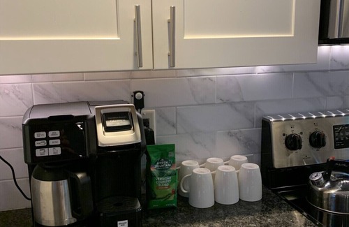 Downstairs is a spacious queen bedroom that includes a dedicated workspace, a large reclining sofa in front of a big-screen TV! You’ll have easy access to a grand private patio and the backyard right from this room (note: the downstairs gas fireplace is not currently functional). We provide a pack-n-play, that serves families with young children or pets who may enjoy the quiet and additional privacy it offers.