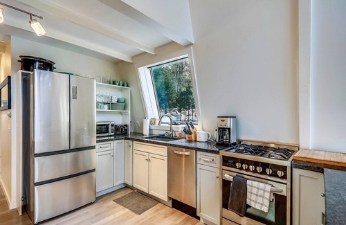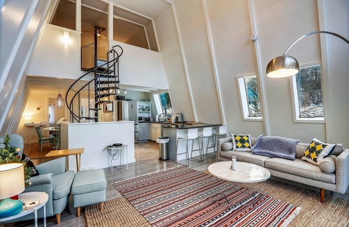 A cozy light filled A -frame cabin nestled in the woods and in the heart of Stowe's Lower Village. This newly renovated three bedroom, two bathroom property has been modernized with brand new appliances, colorful rugs and a spiral staircase leading up to a private bedroom. A second bedroom is on the main floor with a nearby bathroom, while the third bedroom is on the lower level. The wrap around deck has a gas grill for barbecues for a small group. This makes a perfect getaway for anyone wanting the quintessential Vermont experience. The lower level's open floor plan lets everyone enjoy the vacation together while the private bedrooms make you feel right at home. Large windows let in the light and give you a peek at Stowe's scenery, entreating you to head outside and experience it in person. For winter sports enthusiasts, the closest Mountain Road shuttle stop is only 0.3 miles from the door.