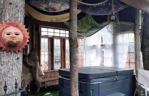 This cabin sits in a neighborhood but is very private. You must be okay with spiral staircases in order to access this home's 2nd floor and tree house.