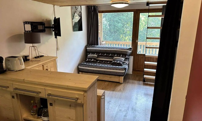 Accommodation: Ideal for a holiday with family or friends, we offer in Demi-Quartier this studio of 21 m2, can accommodate up to 4 people.The studio is on the second floor. It offers a South-East exhibition.Composition of the studio:- TV lounge and dining area.- Kitchenette equipped with refrigerator, oven, microwave, 2 electric plates and hood, coffee maker, toaster.- Mezzanine with double mattress (140).- Bathroom with bathtub- Independent toiletAdditional facilities: Ski storage, outdoor parking, raclette equipment and fondue equipment.Additional services (optional, with surcharge, subject to reservation and subject to availability; for prices, contact us):- Wi-Fi box rental - Rental of linen: linen, towels- Rental of childcare equipment: high chair, umbrella bed- End-of-stay householdPillows, duvets and blankets, and dishes are provided in the rental.No household products are provided in the rental.