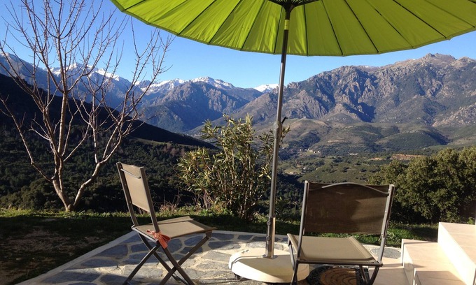 picturesque village of the Corsican center (10 min CORTE) built on a panoramic .Vue rocky outcrop on the highest Corsican mountains, many opportunities for new .T2 trips, air conditioned, equipped kitchen, terrace and private garden, barbecue, TV (international channels included), WI-FI. Very bright, tranquility assured, stunning views of the Corsican Mountains chain .Parle French, English, Russian, Corsica. Ground floor villa.
