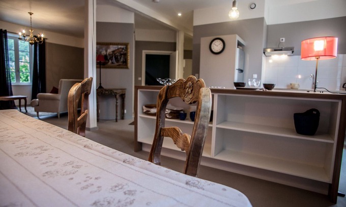 This apartment has been completely redone ,, the 1st floor of a residential house, 2 storeys. Entrance, kitchen, (central island), large room living room, 2 bedrooms, bathroom, toilet. Quiet, near a kindergarten, the municipal swimming pool and the municipal stadium, 1 Km from the water on the LOT (fishing and water skiing), 2 steps from all shops. Housekeeping, linens and towels provided. Heating fuel.