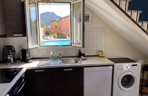 In the heart of Balagne, 10 minutes from Ile-Rousse, ideally located in a residence with the scent of a traditional Corsican village, with POOL, AIR CONDITIONING and FREE WI-FI, this bright and well decorated apartment opens onto 2 terraces, sea and mountain views, a pleasant living room with terrace, garden furniture, deckchairs, new sofa bed, flat screen TV with foreign satellite channels, a well-equipped American kitchen, dishes and utensils, oven and microwave, ceramic hobs, fridge-freezer, dishwasher, washing machine with iron and ironing board, toaster and kettle, coffee maker and Nespresso, BBQ, multi-function grill with rotating skewers, one bedroom with 2 single beds, cupboards, and terrace, chair and baby bed, bathroom with WC, sink and bath, upstairs a master bedroom with mezzanine, with shower, sink and cupboards.