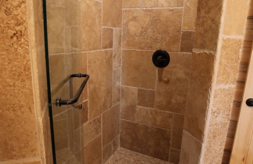 This is a single log cabin style room with a luxury bathroom included. It has been recently remodeled with travertine floors throughout (no carpet). The room features a travertine bathroom and a kitchen with granite counter tops and custom hickory cabinets. It has handmade log beds.
