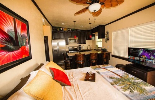 The Tahitian inspired suite has a plush sofa which converts into a queen size bed along. Smart TVs are in every room and you can watch HBO or Netflix. This Suite offers a fully functional kitchen with all the conveniences of home including dishwasher, electric stove, 33" refrigerator, ice maker, utensils and disposal.