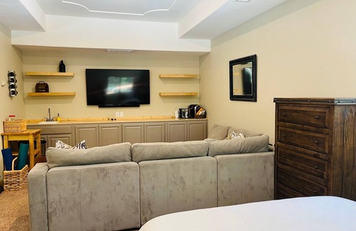 Downstairs you will find an additional, large living area complete with 65" TV, 2 queen beds, a remodeled full bath with walk in shower, workout equipment, and popcorn maker.