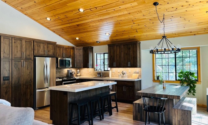 The open living space upstairs features a large kitchen island and a wood burning fireplace. A connecting deck allows for grilling and dining outside. The remodeled kitchen includes quartzite counters and full-size stainless steel appliances. The wood dining table has seats 8 comfortably with seating for four more at the kitchen island. Watch shows on the 55in TV with streaming. Kiddos can enjoy a kids corner fully equipped with table and chairs, games and art supplies.