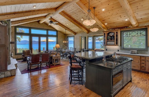 Tahoe's Ahwahnee was constructed and modeled with Yosemite's grand lodge, The Ahwahnee, in mind. With a distinct and wonderful feeling in their own Tahoe lodge, the attention to detail is apparent throughout the house. The first floor features hand-planed pecan floors and a spectacular granite stone, wood-burning fireplace. In addition to granite and limestone counters throughout the house, the primary suite bath has handset tumbled stone mosaics. To top it off, the unobstructed panoramic lake view is unsurpassed. In fact, you can enjoy this beautiful lake view from every room in the house.