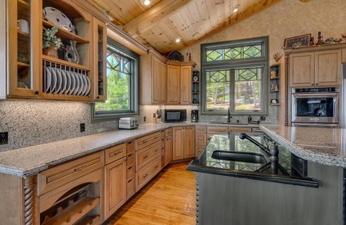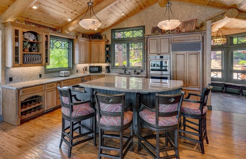 The house is also great for family fun. The bunk room features pine log bunk beds, a hand painted mural of local flora and fauna, and hand-carved bear cubs and squirrels. Other carved pieces throughout the home include the family room mantel, staircase panels and great room support posts. The children's bath and family entry include petroglyph story tiles of mountains and animals etched into the slate. The kitchen features a large cook top island and top-of-the-line specialty appliances. The beds in all the bedrooms are so cozy you may never want to leave. This is not just a rental, it is a home that the owners are willing to share with our guests. This home is our slice of heaven.